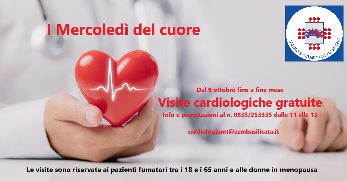 A partire dal 9 di ottobre e fino alla fine del mese, negli ambulatori di Cardiologia dell'Ospedale Madonna delle Grazie di Matera (Corpo B, primo piano) sarà possibile sottoporsi a visite gratuite.