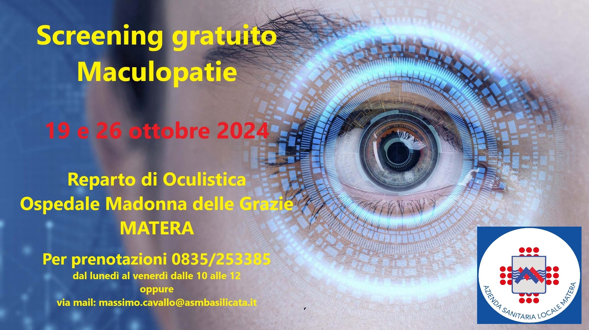 Nelle giornate del 19 e del 26 ottobre, dalle ore 9.30 alle ore 14.30, presso dell’Unità Operativa Complessa di Oculistica dell'Ospedale Madonna delle Grazie di Matera, sarà possibile sottoporsi allo screening per la maculopatia. La fascia d’età interessata va dai 70 agli 80 anni.