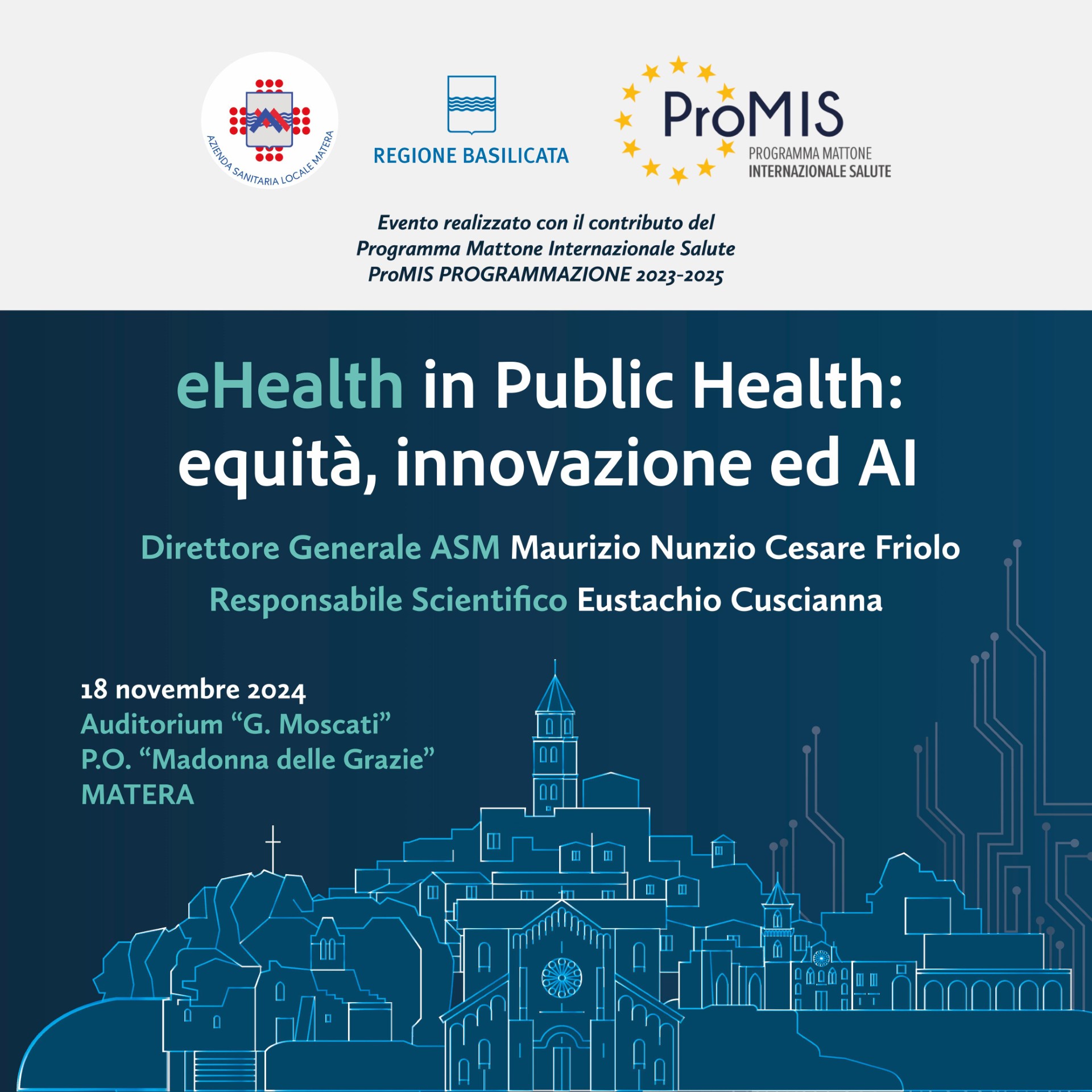 Si parlerà di sanità digitale, lunedì 18 novembre a Matera nel corso del convegno ASM dal titolo "eHealth in Public Health: equità, innovazione ed AI", realizzato con il contributo del Programma Mattone Internazionale Salute – ProMIS programmazione 2023-2025. Organizzato dall’Azienda Sanitaria Locale di Matera l’evento ECM si svolgerà a partire dalle ore 9 nell'auditorium dell’ospedale Madonna delle Grazie di Matera. L’incontro propone un'approfondita analisi delle sfide relative alla prevenzione, diagnosi e cura delle patologie emergenti, focalizzandosi su strategie innovative e approcci multidisciplinari. Ad introdurre i lavori sarà il Direttore Generale dell’ASM, Maurizio Friolo, al quale farà seguito la Lectio Magistralis di Antonio Felice Uricchio, professore ordinario di Diritto Tributario dell’Università degli Studi di Bari Aldo Moro e presidente dell’Agenzia Nazionale di Valutazione del sistema Universitario e della Ricerca.