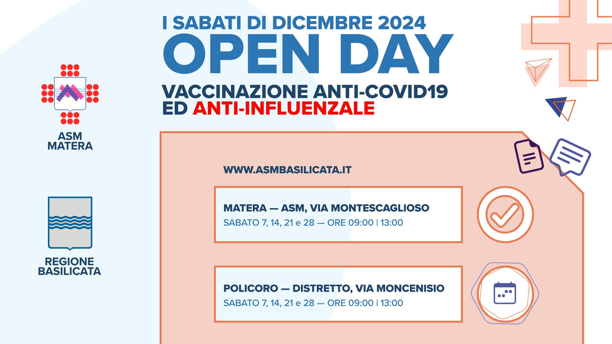 La Regione Basilicata e l'Azienda Sanitaria Locale di Matera consolidano la campagna vaccinale 2024-2025, contro l'influenza e il COVID-19, confermando l'attivazione, in tutti i sabati del mese di dicembre, dei Punti Vaccinali Territoriali di Matera e Policoro. Gli Open Day ASM avranno luogo, dalle ore 9:00 alle 13:00, presso i Punti Vaccinali Territoriali di Matera in via Montescaglioso (sede ASM) e di Policoro in via Moncenisio (Distretto Sanitario).