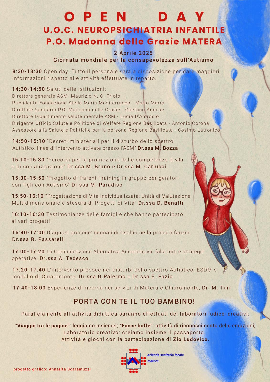 L’azienda Sanitaria Locale di Matera aderisce alla Giornata mondiale per la consapevolezza sull’autismo con un open day al reparto di Neuropsichiatria Infantile dell’Ospedale Madonna Delle Grazie che avrà luogo mercoledì 2 aprile. L’open day è un’occasione importante per sensibilizzare la comunità sull’inclusione e il supporto alle persone nello spettro autistico. Il reparto di Neuropsichiatria Infantile apre le sue porte (al terzo piano, scala A) offrendo incontri, approfondimenti e attività dedicate a famiglie, insegnanti e professionisti del settore. Durante l’open day, al quale interverrà anche l’Assessore regionale alla Salute e Politiche della Persona, Cosimo Latronico, tutto il personale del reparto sarà a disposizione per la presentazione dei servizi e delle attività e per dare informazioni sull’autismo. Nel corso della mattinata Infine saranno organizzati laboratori per bambini e ragazzi con esperienze educative, ludiche e sensoriali per favorire l’espressione e la comunicazione.