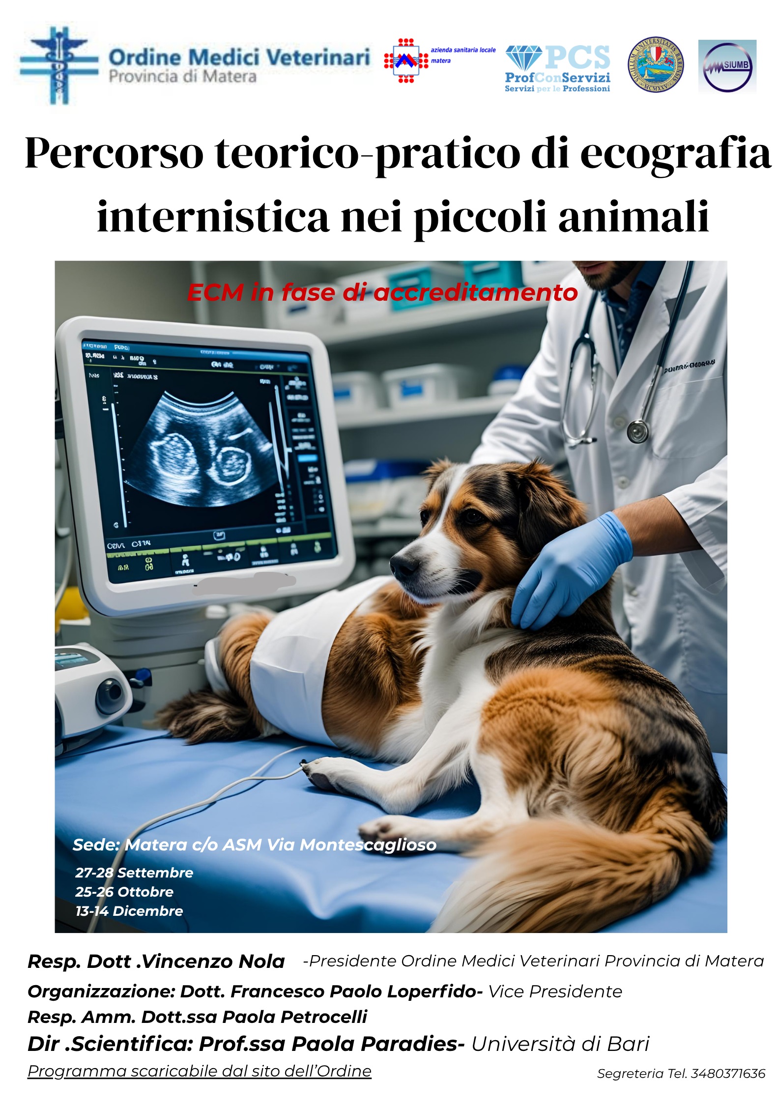 L’Ordine dei Medici Veterinari della Provincia di Matera, con il patrocinio dell’Azienda Sanitaria Locale di Matera (ASM) e la Facoltà di Medicina Veterinaria dell’Università di Bari, promuove il “Percorso teorico-pratico di ecografia internistica nei piccoli animali”, un’iniziativa di alta formazione dedicata ai professionisti del settore veterinario.
